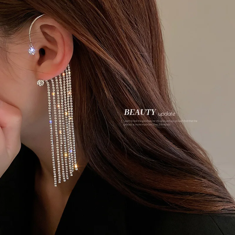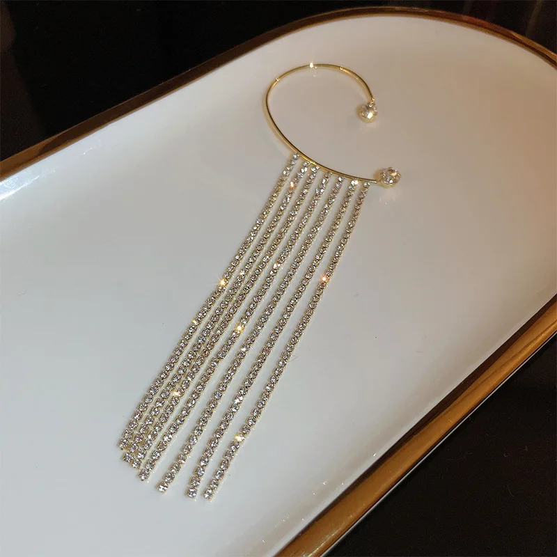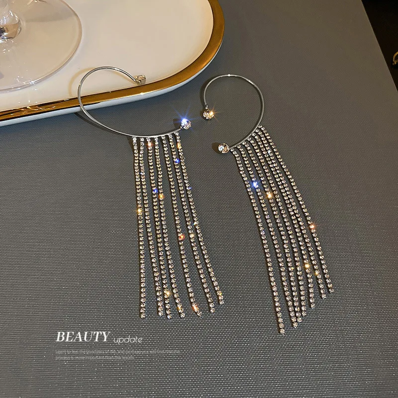 Luxury Shining Zircon Rhinestone Long Tassel Ear Clip Ear Cuff Exquisite Vintage Clip Earrings Party Jewelry